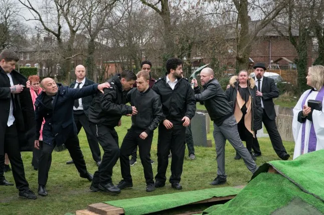 In a shocking turn of events on Coronation Street, a mysterious woman in black appears at Theo’s funeral, leaving everyone