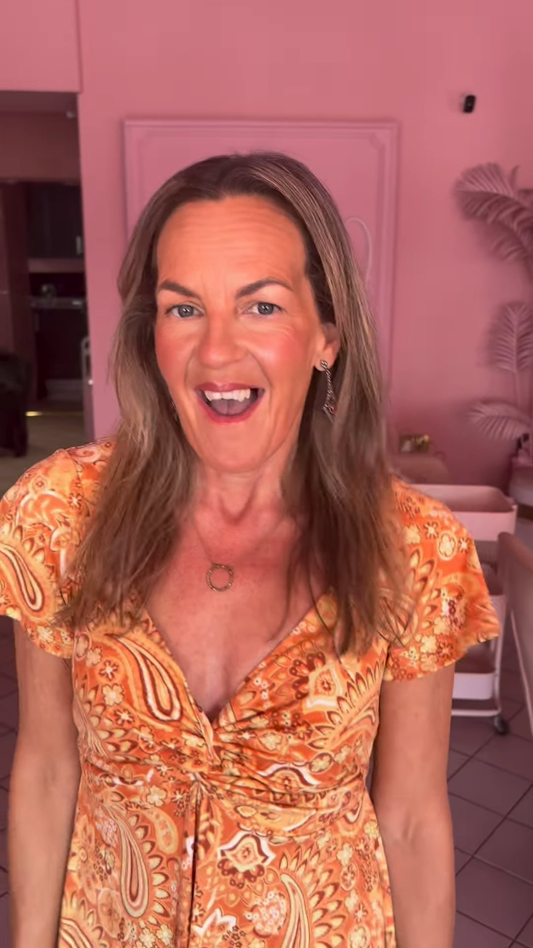 Lorraine Stanley smiling in an orange paisley dress.