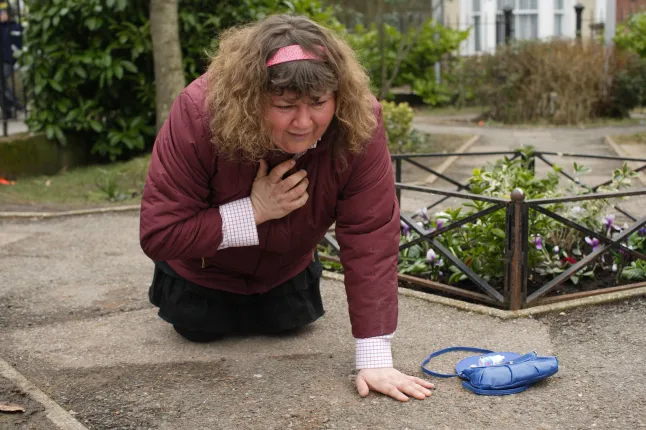 Heather Trott as played by Cheryl Fergison, in the midst of her asthma attack in EastEnders